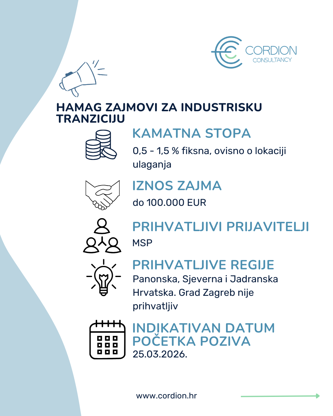Prihvatljive regije za provedbu ulaganja: Panonska, Sjeverna i Jadranska Hrvatska. Grad Zagreb nije prihvatljiv